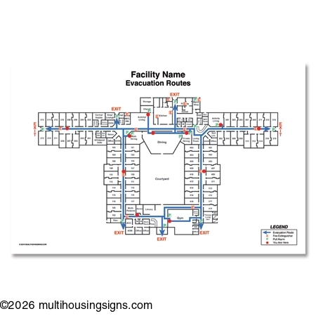 - Identifies "You Are Here" location, fire extinguishers, pull alarms, and escape routes.