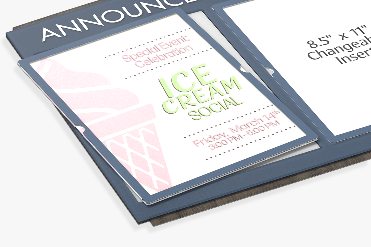 • Three insert holders with protective lens covers accommodate printed 8.5" x 11" pieces of standard paper.